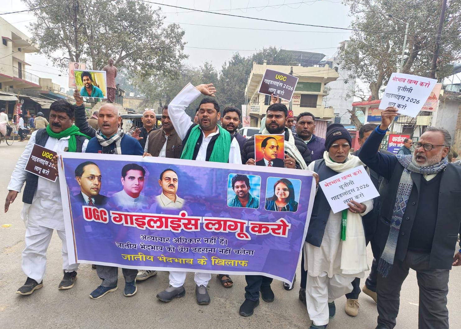आजमगढ़ 2 फ़रवरी 2026। यूजीसी इक्विटी नियमावली लागू करने की मांग को लेकर सामाजिक संगठनों ने जुलूस निकालकर राष्ट्रपति को सम्बोधित ज्ञापन जिलाधिकारी को सौंपा। जगदेव प्रसाद की जयंती के अवसर पर प्रदर्शनकारियों ने यूजीसी गाइडलाइंस लागू करो, जाति जनगणना कराओ, न्याय पालिका में प्रतिनिधित्व की गारंटी करो, रोहित वेमुला अमर रहें, पायल ताड़वी अमर रहें के नारे लगाए।